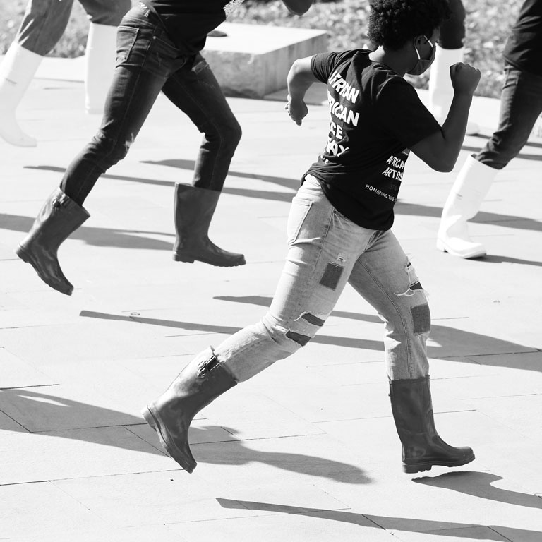 The history of IsicaXulo traverses time, function, place, and bodies. At first a South Africa regional Zulu dance performed to acoustic instruments, IsicaXulo made its way to the country’s diamond mines during its colonial initiation. Laborers in the mine shafts would employ the dance to maintain their morale thru otherwise physically and spiritually oppressive work conditions. When the dance made its way to the trade loading docks of the Cape Town coast, it incorporated the rubber Wellington boots the dock workers wore for protection, hence the name “gumboot”. Like Tsoi-Tsoi, the fist-pumping march of solidarity, IsicaXulo served as embodied resistance during the abolishment of Apartheid, a governmental system of institutionalized racism and oppression in South African from 1948 to the early 1990’s.